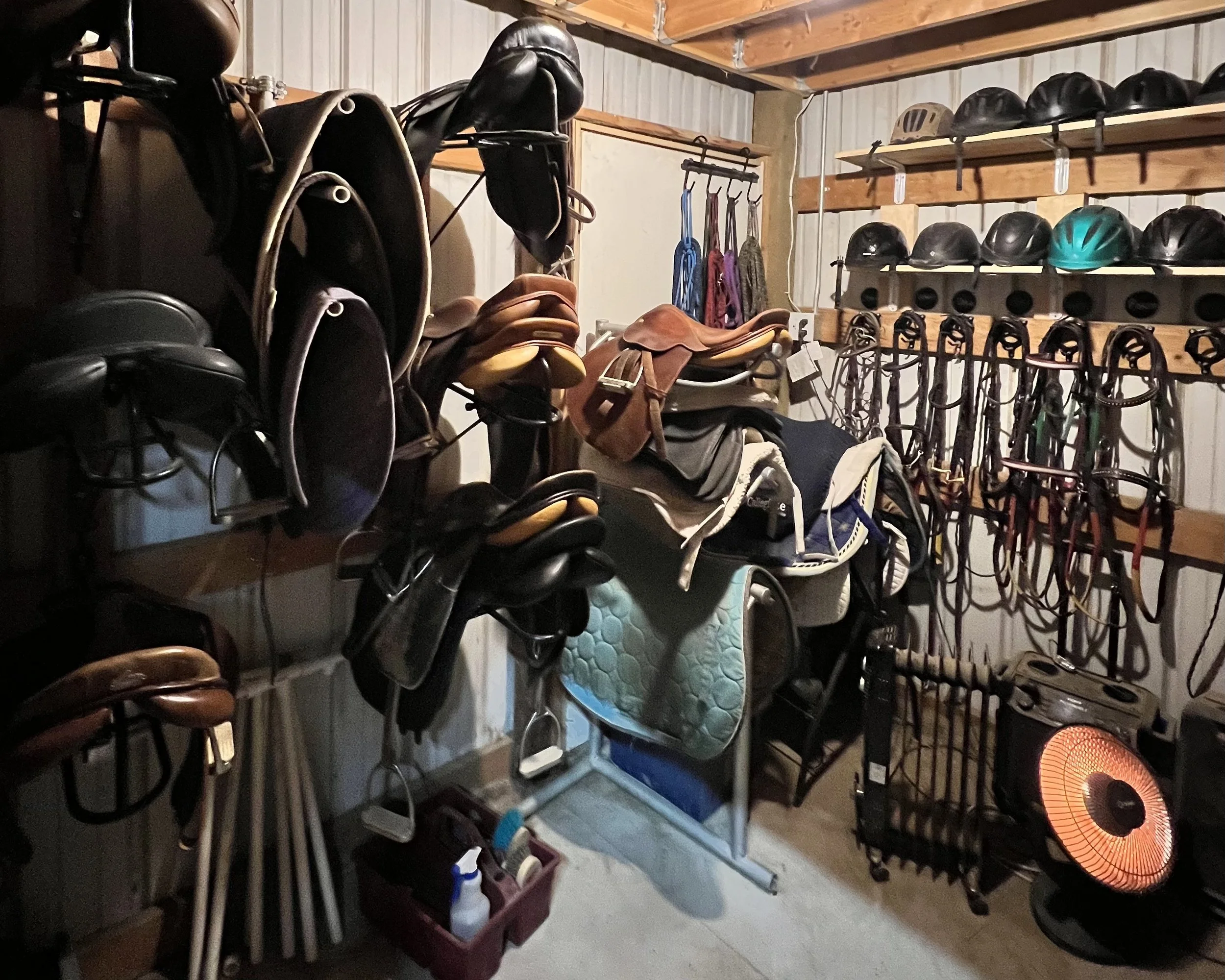 Our tack room is spacious and it is heated in the cold winter months to ensure all tack is safely stored and protected. We have wall mounted saddle racks, bridle & halter hooks, and saddle pad holders. We also have shelving for food, supplements, grooming products, treats and more.